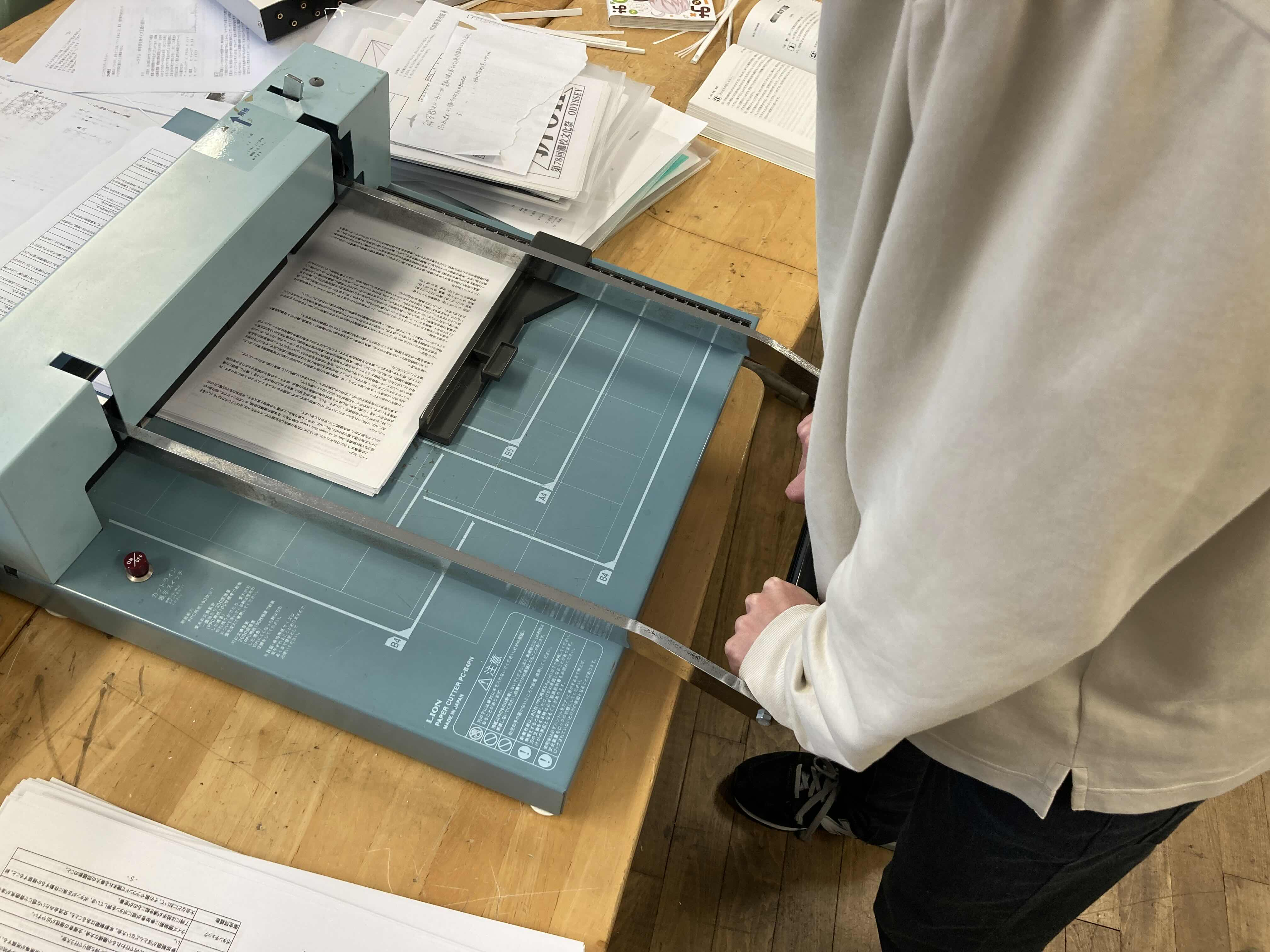 次に裁断という作業があります。印刷の効率化のため、印刷物の印刷は全てB4サイズで行っているのですが、それを場合によってB5サイズにカットしていきます。たくさんの紙を一気にザクっと切っていく時の感触がたまらないです。